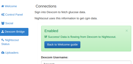 Entering the credentials to Dexcom Clarity should allow T1Pal to verify the credentials and configure Nightscout through the Dexcom Bridge.